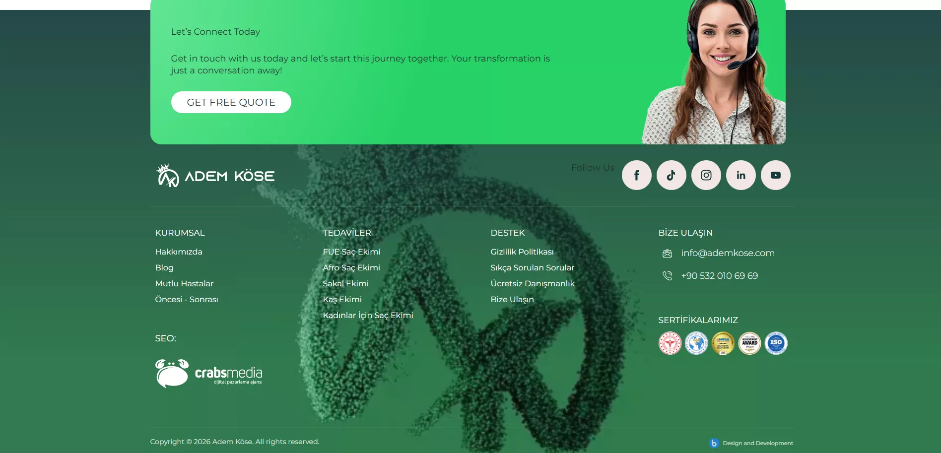 Yapılan çalışmaların ardından Adem Köse web sitesi daha hızlı, daha erişilebilir ve arama motorlarıyla uyumlu bir yapıya kavuştu. Organik trafik artışı, kullanıcı etkileşimleri ve iletişim taleplerinde gözle görülür bir yükseliş elde edildi. Bu proje, Crabs Media’nın sağlık ve estetik alanında sunduğu stratejik, teknik ve içerik odaklı dijital çözümlerin başarılı bir örneği oldu.