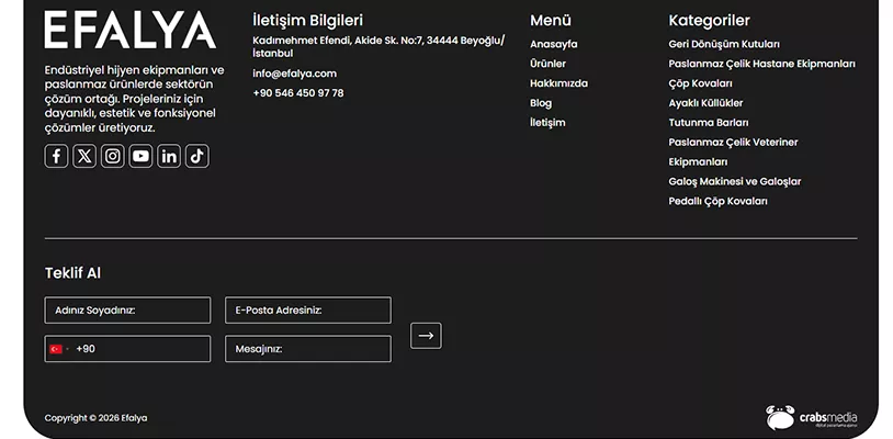 Projenin ilk aşamasında Efalya’nın hizmet yapısı ve hedef kitlesi detaylı şekilde analiz edildi. Kullanıcıların site içinde rahat gezinmesini sağlayan, mobil uyumlu ve hızlı açılan bir yapı oluşturuldu. Bu süreçte içerik düzeninden teknik SEO ayarlarına kadar tüm detaylar ele alındı ve Crabs Media yaklaşımıyla sayfa yapıları arama motoru kriterlerine uygun hale getirildi.