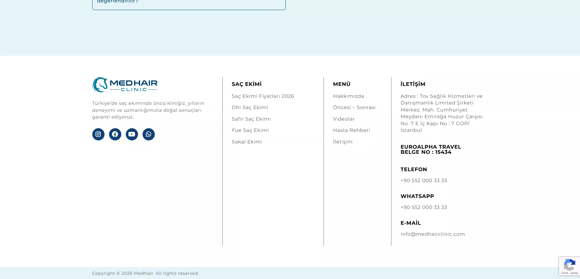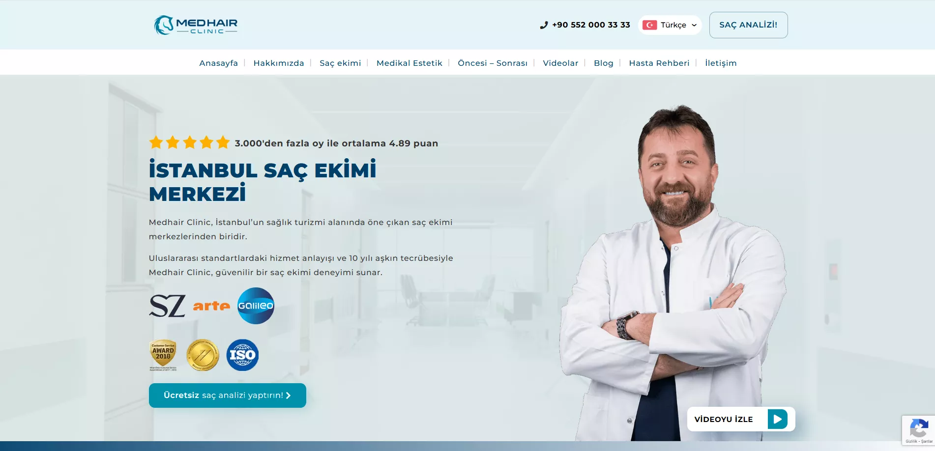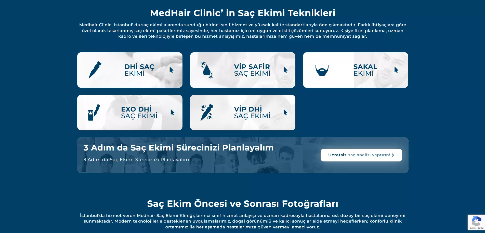 Saç ekimi alanında hizmet veren Medhair Clinic, dijitalde daha güçlü ve güven veren bir yapı hedefliyordu. Mevcut web sayfası hızlı açılmıyor, içerikler arama motorlarında yeterince görünmüyordu. Hedef, yurt içi ve yurt dışı ziyaretçiler için sade, hızlı ve anlaşılır bir site oluşturmaktı. Bu süreçte kullanıcıyı yormayan bir yapı ve açık bilgi akışı öncelik oldu.